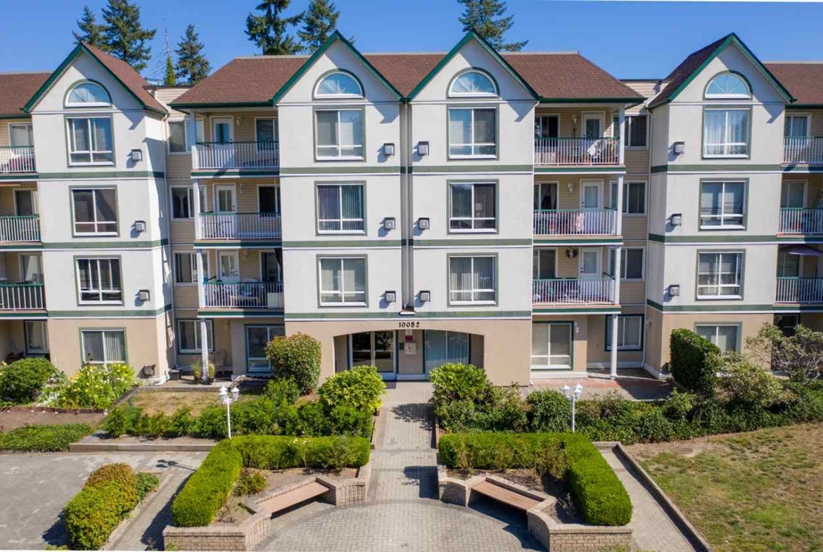 Welcome to Melrose Court, RARE 1 bed 1 bath ground level apartment with a large layout available now! This home has it all from granite counters w/breakfast bar in kitchen to plank laminate flooring in main living space and 9 foot ceilings. Bathroom updated w/granite and porcelain tiles. Covered patio, surrounded by greenery, very private. Facing quiet residential street w/plenty of extra parking available. Rain screened building. Located in the heart of Surrey, close to City Centre, Skytrain, SFU Campus, and much more! This one will not last long, Act Fast!